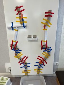 Nicht nur in den Forscherwochen erleben die Kinder die Bereiche Mathematik, Informatik, Naturwissenschaft und Technik (MINT), sondern jeden Tag im Kitaalltag. So wurde aus einfachen Alltagsmaterialien eine Murmelbahn gebaut, an der die Kinder in den verschiedenen Bereichen ihr Wissen erforschen und anwenden können.