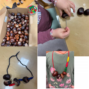 - Wir legen die Perlenkette aus Kastanien vor uns hin und schauen, welche Muster entstehen: abwechselnd hell und dunkel, groß und klein.