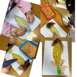 - Danach kleben wir viele Maiskörner darauf wie echte Körner.