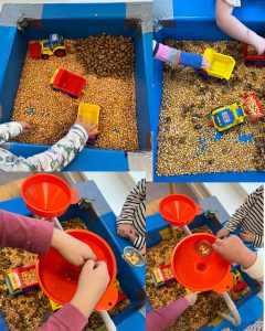 Mit Neugier und viel Spaß wurde geforscht, geschüttet und verglichen! Größen wurden vergliechen. Was läuft schneller und was langsamer durch die Trichter.