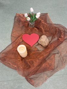 Auf einem braunen Tuch, das die Erde darstellt, lag ein Stein, ein Herz und viele bunte Blumen.